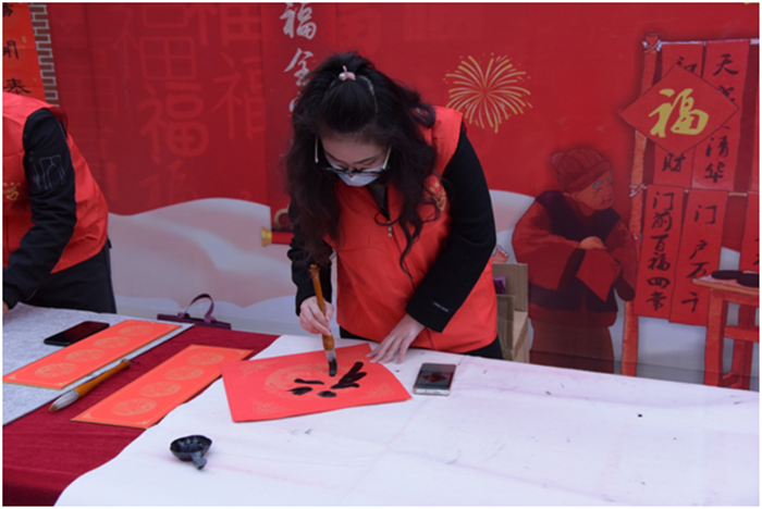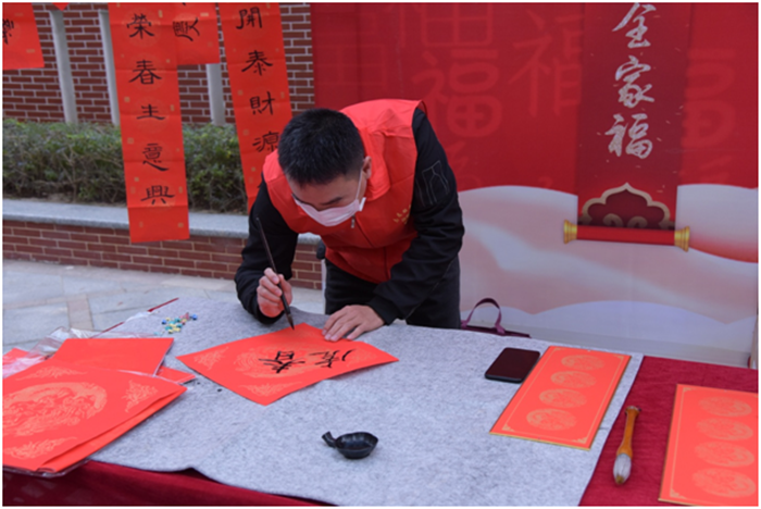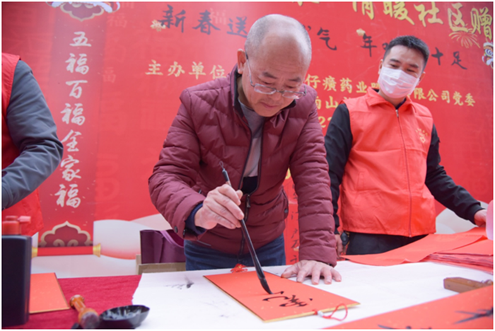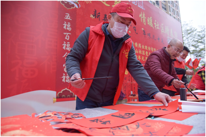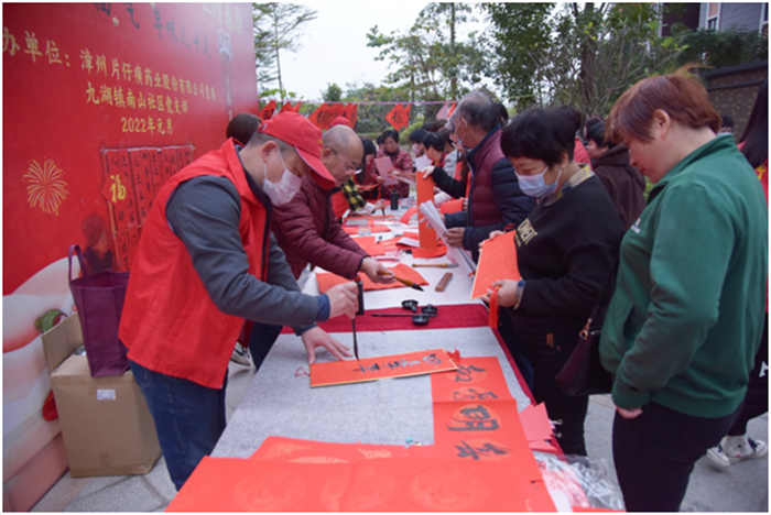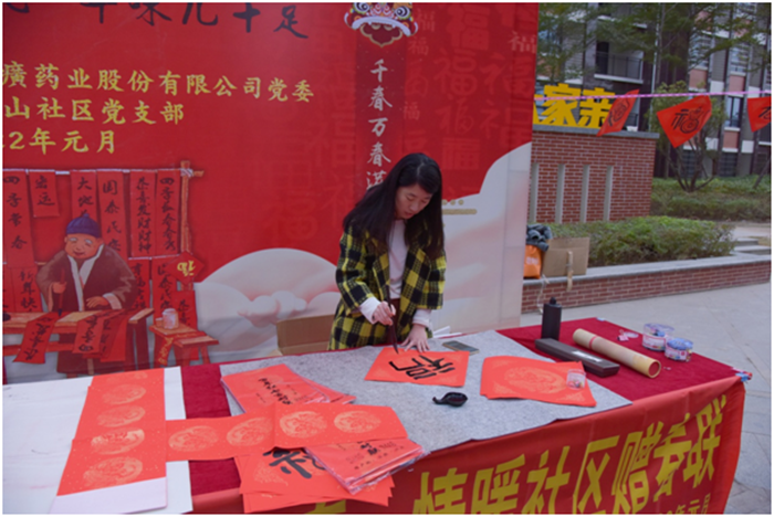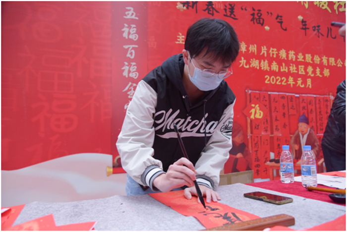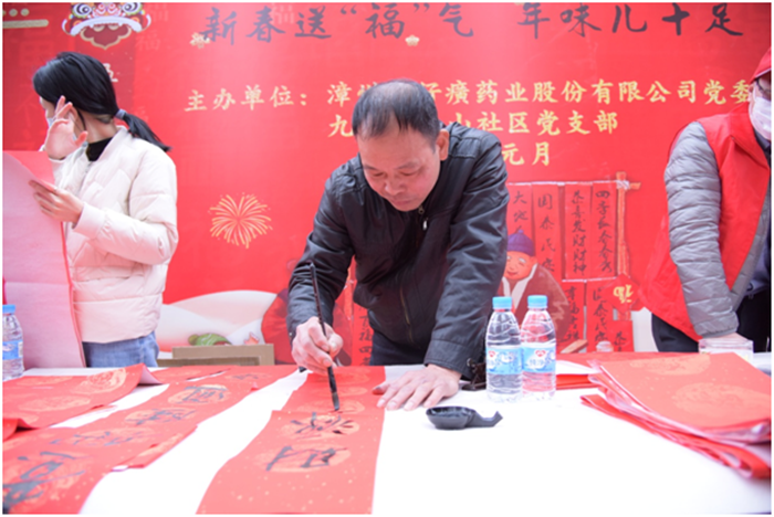 寫春聯、貼福字、貼窗花是中華民族歡度春節的傳統習俗,象征著吉祥如意,更表達了人們對來年事事順遂的美好愿景。為進一步弘揚中華優秀傳統文化,營造歡樂祥和的節日氛圍,弘揚向上向善的道德風尚,2022年1月18日上午,片仔癀公司黨委以近鄰黨建為引領,攜手九湖鎮南山社區黨支部在南星小區舉辦“墨香四溢迎新春 情暖社區贈春聯”活動,邀請公司職工、職工子女及社區書法愛好者現場寫春聯,為即將到來的2022年春節增添年味。