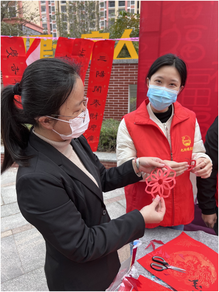另一邊,剪紙愛好者一邊向大家介紹剪窗花的步驟和方法,一邊折疊剪裁,一件件精美的窗花轉眼就在靈巧的手中完成。社區居民們創作出一幅幅精美的窗花,互相給鄰里帶來虎年的喜慶,也提前為彼此送上新春祝福。